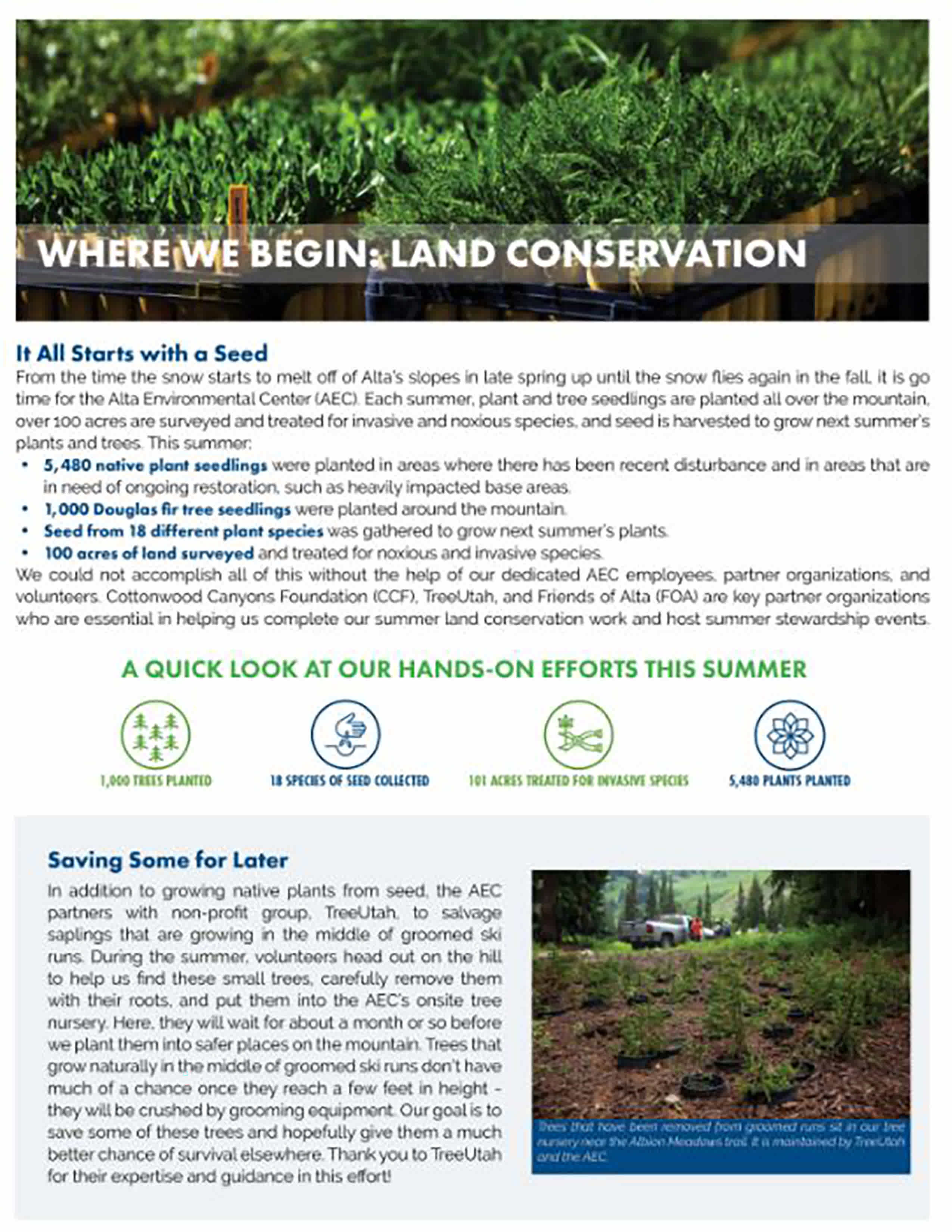 From the time the snow starts to melt off of Alta’s slopes in late spring up until the snow flies again in the fall, it is go time for the Alta Environmental Center (AEC). Each summer, plant and tree seedlings are planted all over the mountain, over 100 acres are surveyed and treated for invasive and noxious species, and seed is harvested to grow next summer’s plants and trees. This summer: