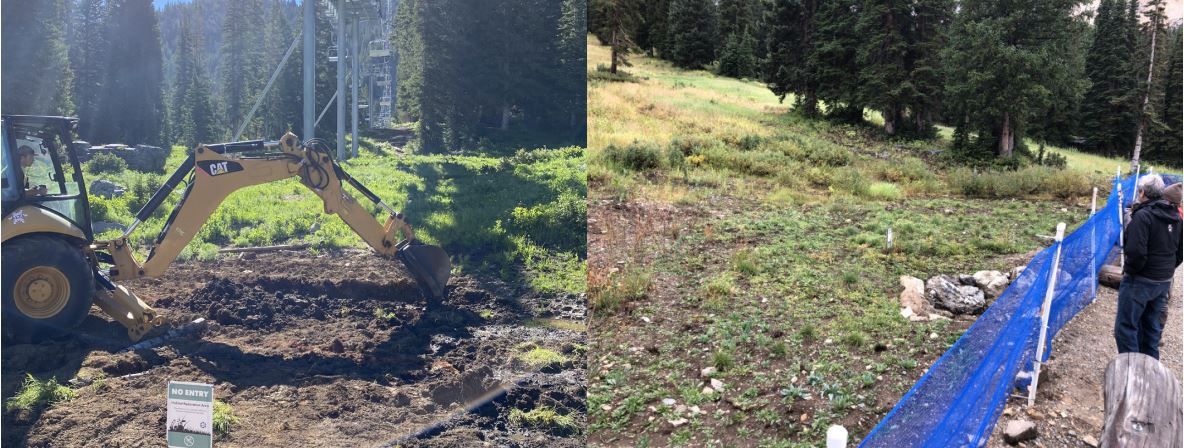 The re-grade project on the front-facing ski runs of Nina’s and Schuss were made in the summer of 2021. The Alta Environmental Center went to work immediately. Erosion blankets lined with a grass seed mix were placed on the face to mitigate silt deposits into waterways and slow erosion. Our commitment to restoration is to plant 1,000 native forbs per acre disturbed, for three years. If three years is not enough, we will continue to plant until native vegetation is covering at least 70% of the disturbed area. 3,280 plants were planted in the Nina’s-Schuss project area in the summer of 2022. This was no small feat, and it required the help of our talented and sure-footed employees. Two employee planting days were held, in which we were able to get half of the needed plants in the ground.